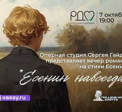 Приглашаем вас на незабываемый вечер, посвященный великому поэту Сергею Есенину! В программе концерта прозвучат самые проникновенные романсы и песни на музыку русских композиторов, написанные на стихи гениального поэта.