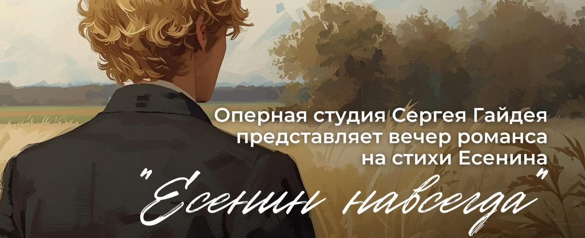 Приглашаем вас на незабываемый вечер, посвященный великому поэту Сергею Есенину! В программе концерта прозвучат самые проникновенные романсы и песни на музыку русских композиторов, написанные на стихи гениального поэта.
