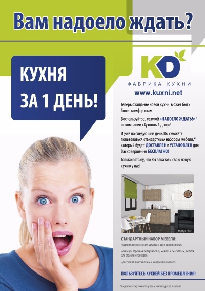 Мебельная фабрика «Кухонный двор» вышла на рынок с эксклюзивным предложением «Надоело ждать». Эта услуга позволяет сделать ожидание ультрамодной высококачественной кухни более комфортным. Если оформить заказ на приобретение новой мебели в «Кухонном дворе», то уже на следующий день можно воспользоваться стандартным кухонным гарнитуром, который будет доставлен и установлен бесплатно. Комплект мебели доступен в классическом и современном стиле, состоит из трех нижних шкафов и двух верхних полок, оснащен варочной поверхностью, мойкой, смесителем и лотком для столовых приборов.
