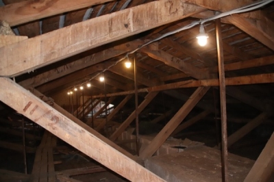 Вот уже третий год вокруг здания «кулька» на улицах Ленина и Есенина установлено ограждение от падающей лепнины. Внутри все гораздо хуже. Вместе с заместителем директора филиала по административно-хозяйственной работе Александром Мешковым мы посмотрели верхний этаж, чердак и крышу здания.