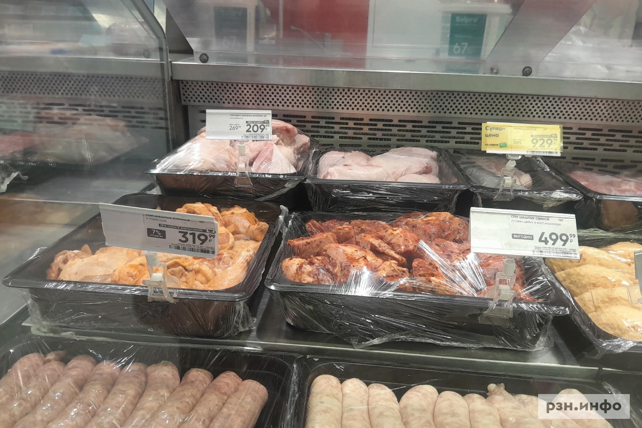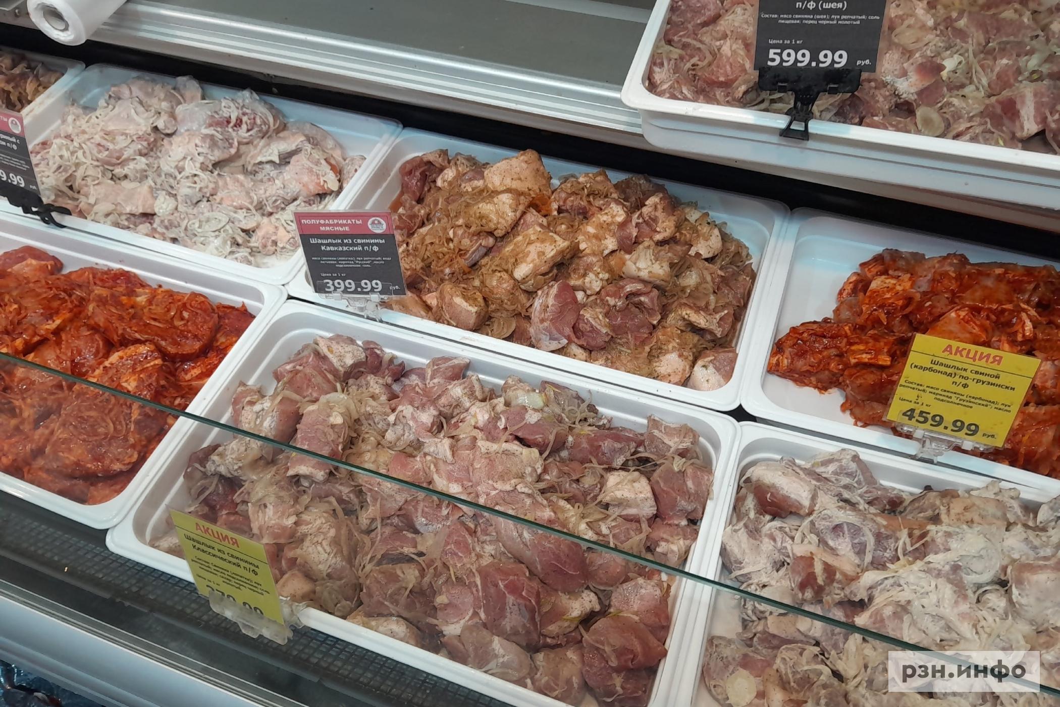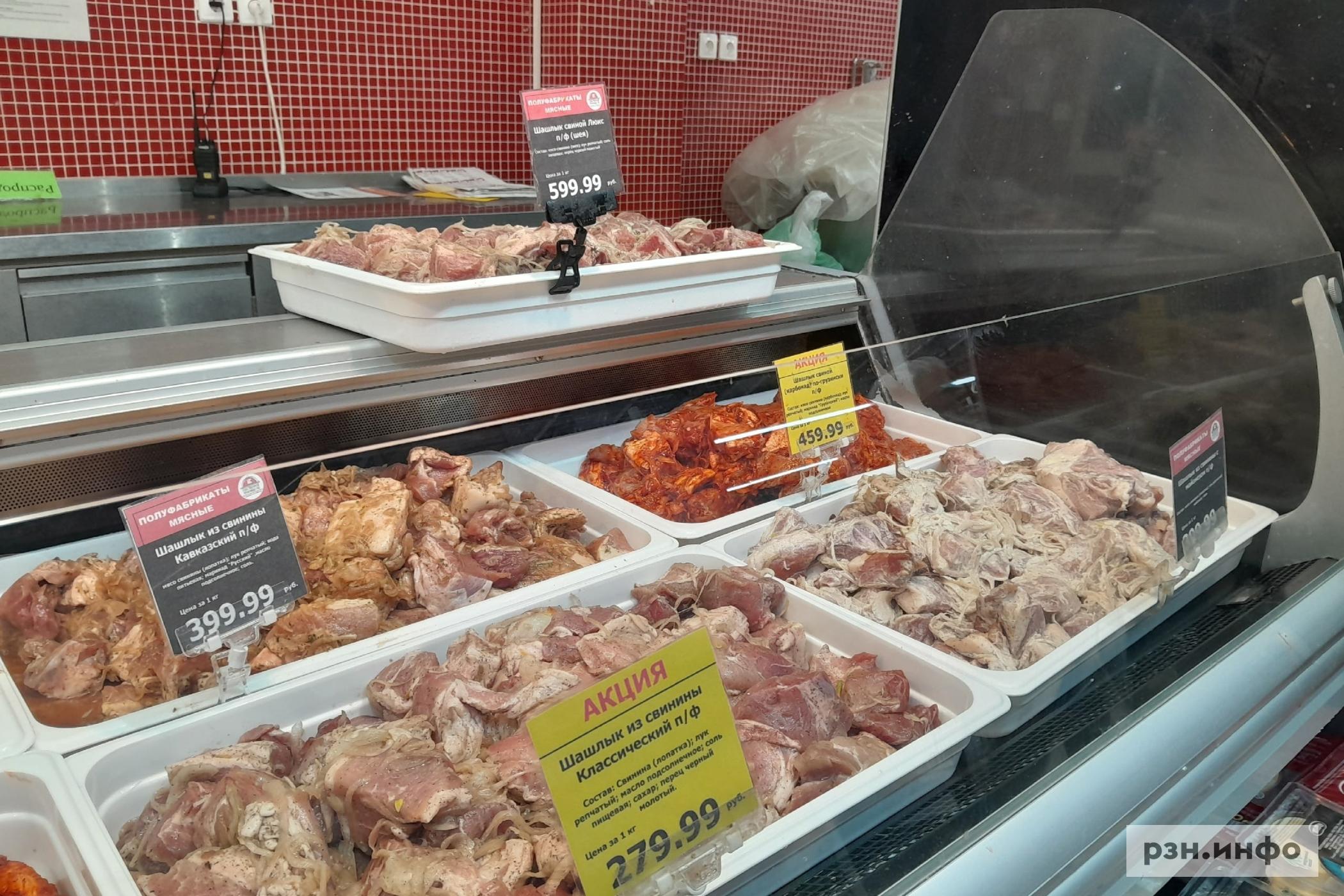 В «Европе» на развес можно приобрести больше видов шашлыка с разным маринадом: за шашлык из свинины с майонезом рязанец отдаст 399 рублей, за свиной карбонад по-грузински — 459 рублей, свиной шашлык из шеи выставлен за 599 рублей, из свинины кавказский стоит 399 рублей, классический стоит 279 рублей, куриный шашлык с майонезом можно приобрести за 279 рублей, из говядины кавказский — 800 рублей.