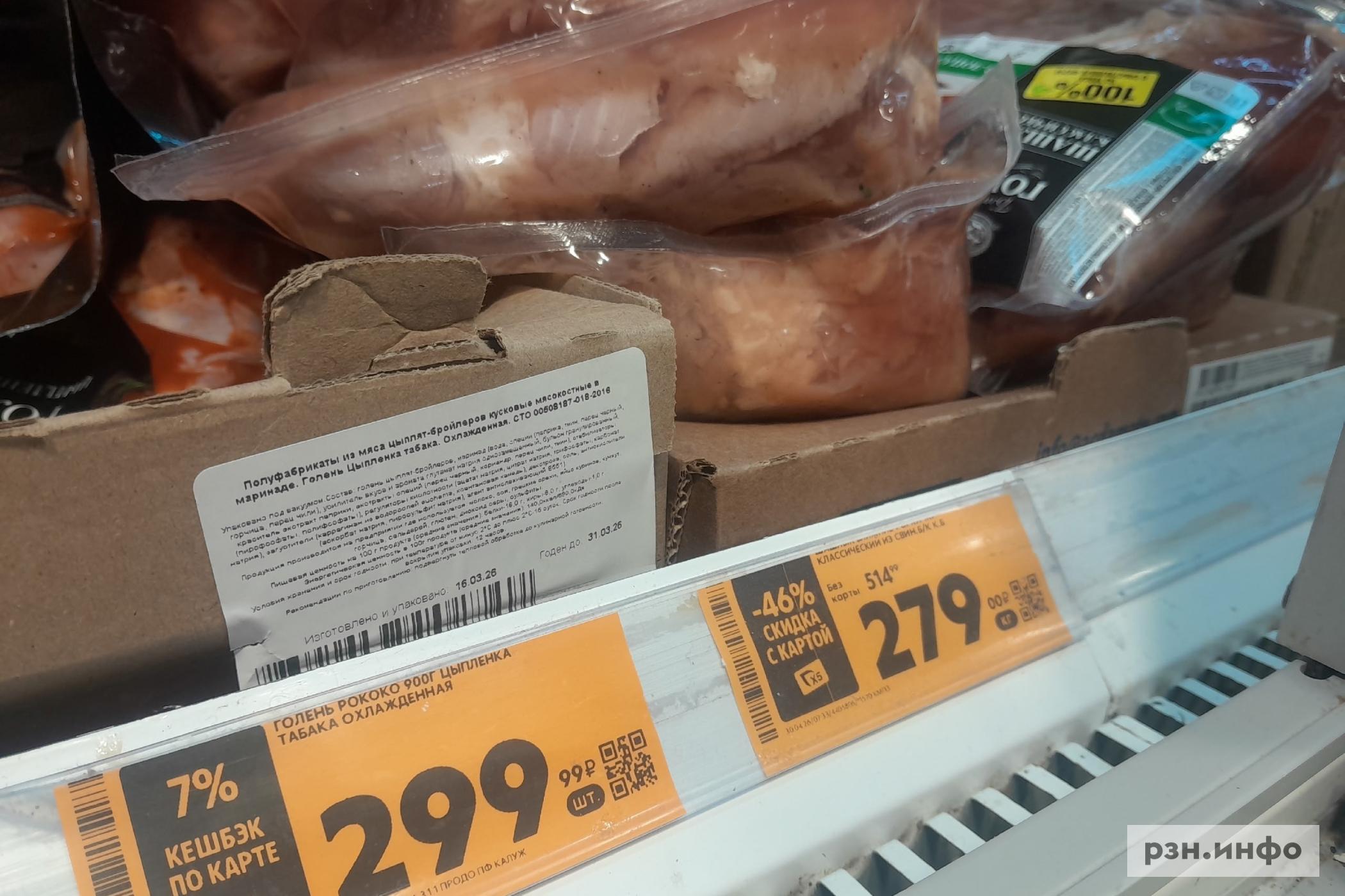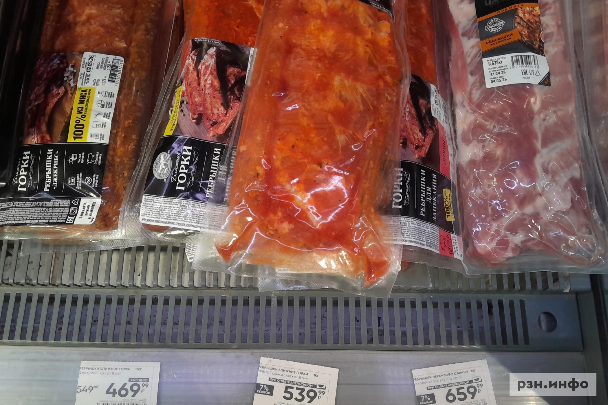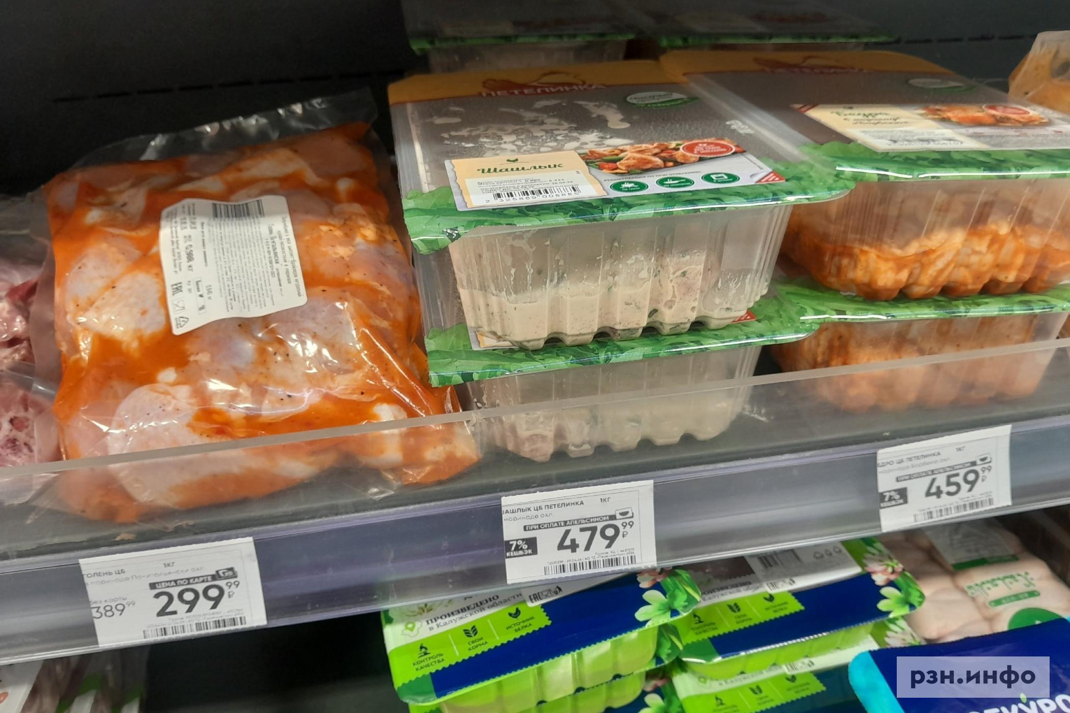 В «Европе» на развес можно приобрести больше видов шашлыка с разным маринадом: за шашлык из свинины с майонезом рязанец отдаст 399 рублей, за свиной карбонад по-грузински — 459 рублей, свиной шашлык из шеи выставлен за 599 рублей, из свинины кавказский стоит 399 рублей, классический стоит 279 рублей, куриный шашлык с майонезом можно приобрести за 279 рублей, из говядины кавказский — 800 рублей.