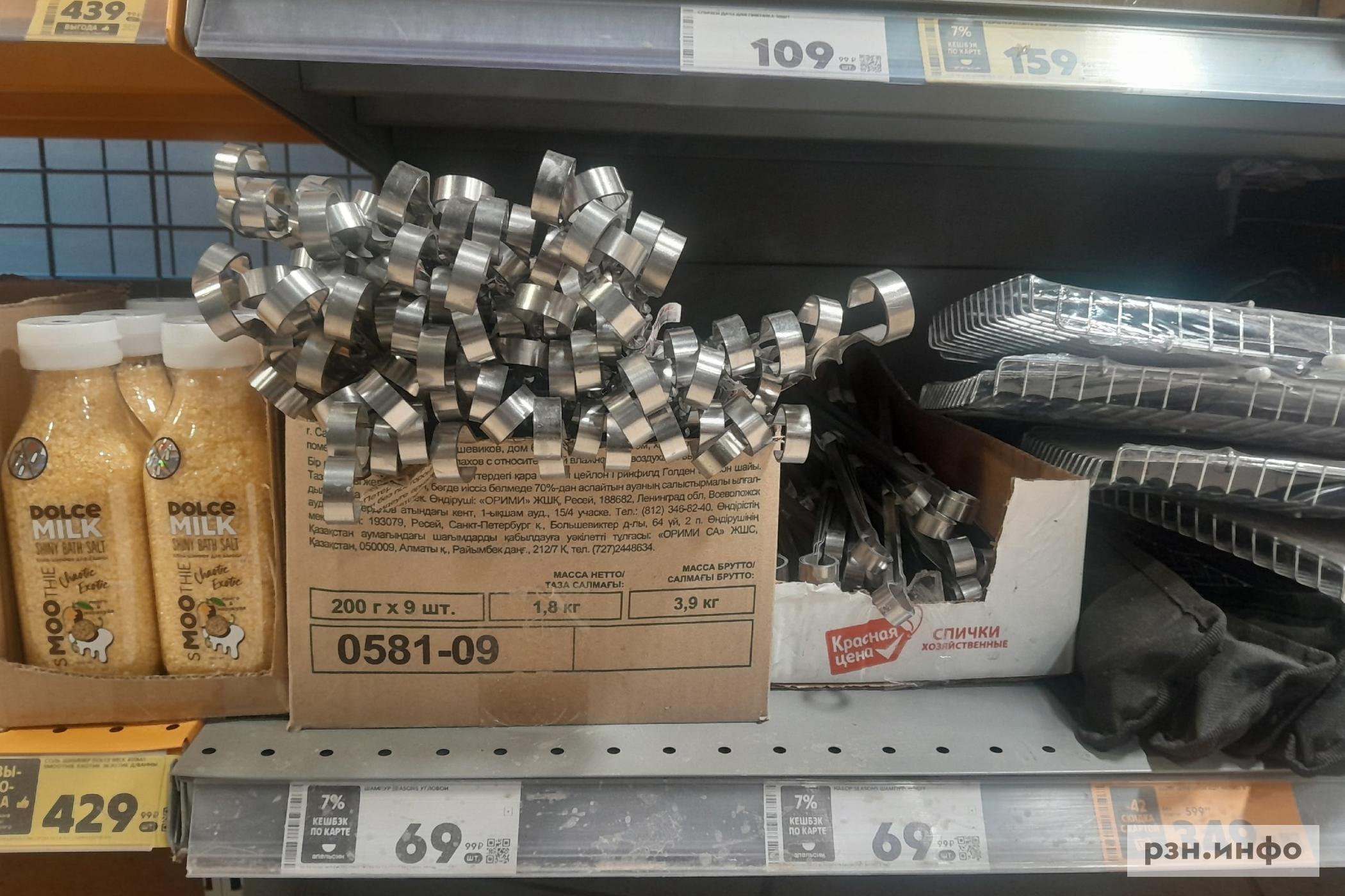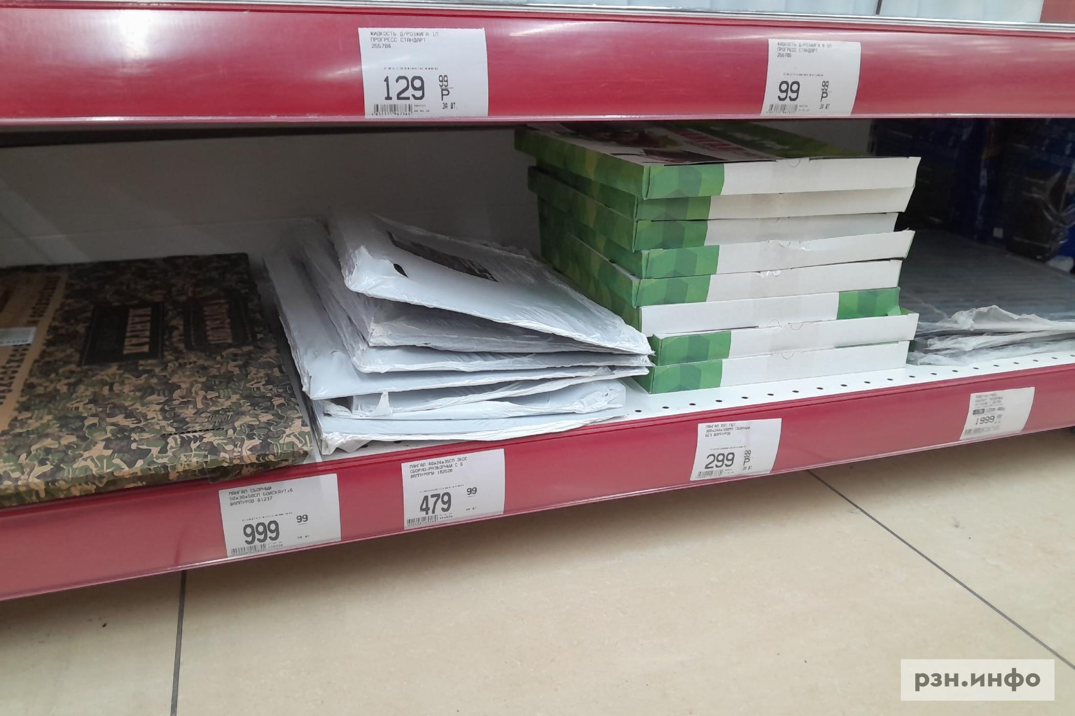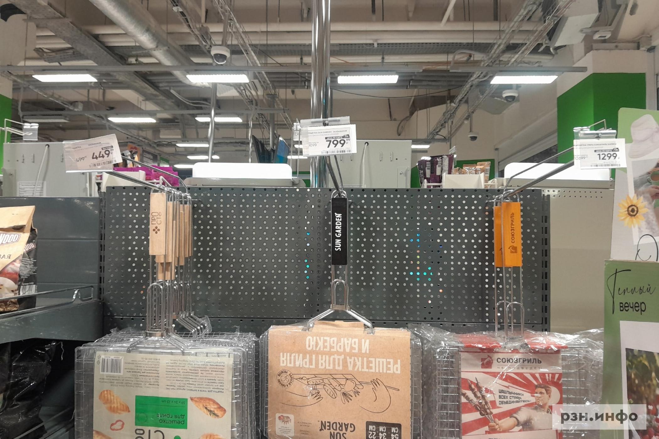 Сборного мангала в магазине не оказалось, на сайте магазина указана цена за самый дешевый — 274 рубля. Шампуры выставлены за 70 рублей за штуку, также на прилавке есть решетки для жарки, их стоимость разнится в зависимости от размера — от 350 рублей до 600. Жидкость для розжига можно приобрести за 150 рублей. Уголь древесный, 2,5 килограмма, — 350 рублей, также на прилавках появились березовые дрова за 450 рублей.