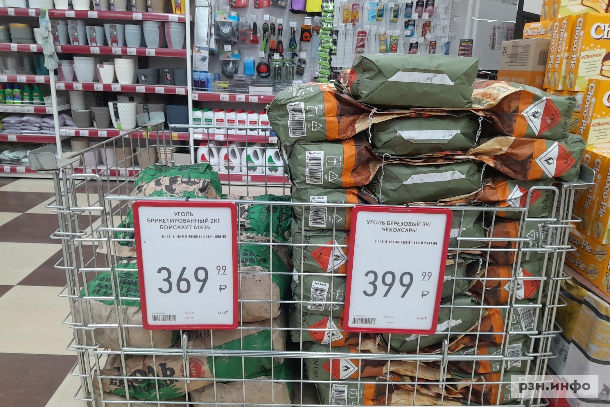За три килограмма угля березового из Чебоксар просят 399 рублей, за брикетированный «Бойскаут» — 369 рублей, за обычный древесный, 2,5 килограмма, — 329 рублей. Жидкость для розжига «Зажигайка», 0,5 литра, обойдется в 199 рублей.