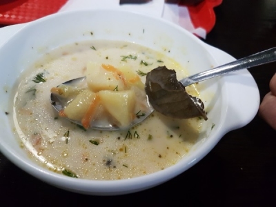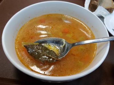 А вот порция супа была большой. В чуть остывшем курином бульоне плавали картошка, перец, горох и даже кукуруза. Не сказать, что я пришел в восторг от вкуса блюда, но соотношение цены, качества и размера порадовало.