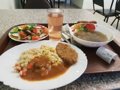 Перловку с кусочками кукурузы и перца женщина на раздаче мне великодушно полила мясным соусом, так что передо мной оказался кусок говядины. Крупа была очень мягкой, видимо, ее варили долго, овощи добавляли блюду немного сладости. А вот котлета наоборот — была чересчур соленой. Внутри зразу буквально набили луком и яйцом, но даже это не спасло ее. Поэтому сладкое приходилось заедать соленым и наоборот.