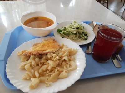 Макароны были разваренными и слипшимися. Я так и представил, что их делали в гигантской кастрюле, и у повара не было времени следить за готовностью и помешивать блюдо. Отбивная с курицей понравилась: необычной для меню столовой оказалась заправка с чесноком. Все это было аппетитно не только на вид.