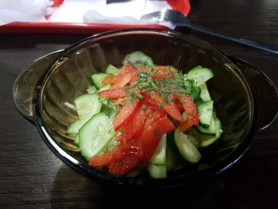 Салат состоял из свежих огурцов, помидоров, перца и лука. Все овощи были свежими, не обветренными и мелко нарезанными, поэтому я быстро расправился с ними. Перед подачей по моей просьбе его приправили маслом и укропом.