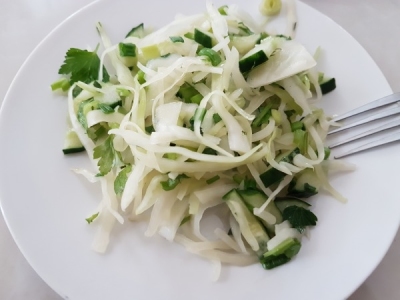 Салат «Зеленый» состоял из огурцов, капусты, лука и петрушки. Все ингредиенты оказались свежими, но пропорции — не совсем уместными. Лука положили больше, чем огурца, поэтому салат быстро пришлось заедать первым блюдом.