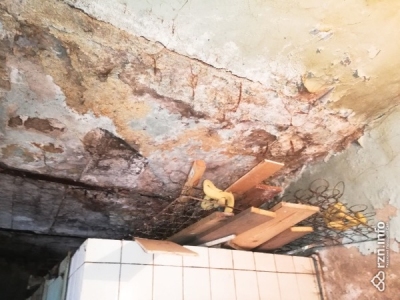 Дом, по утверждению жильцов, никогда не ремонтировался, и если что-то и делалось, то только за средства собственников. В основном здесь живут многодетные семьи и пенсионеры, и собрать достаточную сумму, чтобы что-то отремонтировать, очень сложно. Примерно в середине января в коридоре из-за протечки крыши обвалился потолок. Даже сейчас с него свисают капли воды. В комнатах образовалась плесень.