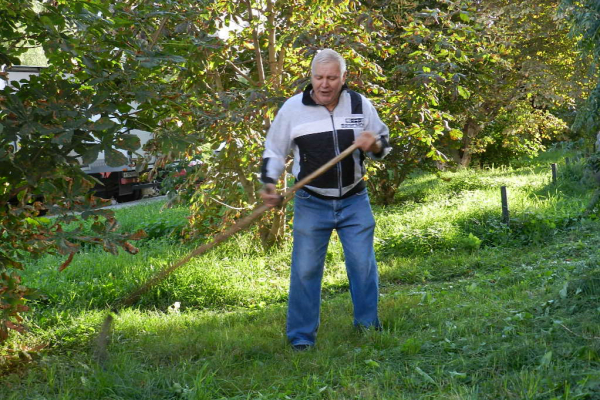 Сергей Аркадьевич сообщает, что коса к работе готова, остается только распеться. И приступает. То есть, начинает косить зеленый участок за домом и петь.