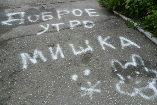 Со второго разглядела оригинальную растительность палисадников: вьющиеся лозы винограда «заползают» на лоджии первых этажей, ниспадают в подвальные проемы. Наконец, подхожу к одному из подъездов и обнаруживаю местный креатив. «Доброе утро Мишка», — пожелание без знаков препинания, но с «портретом» лесного зверя вызывает улыбку. Ранним пасмурным утром, когда хочется вернуться обратно под одеяло, это особенно ценно.