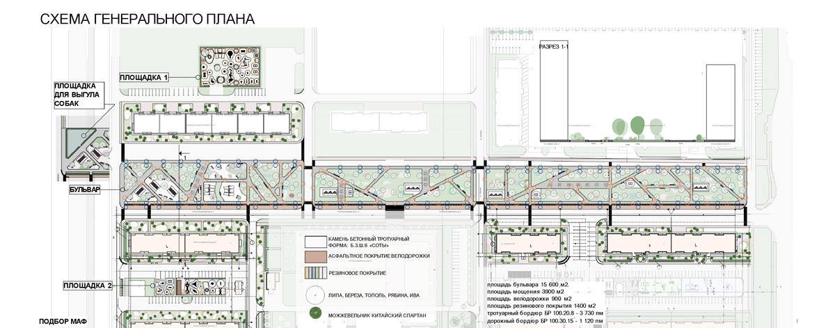Бульвар разделят на две части: парадную пешеходную зону и природно-рекреационный парк.