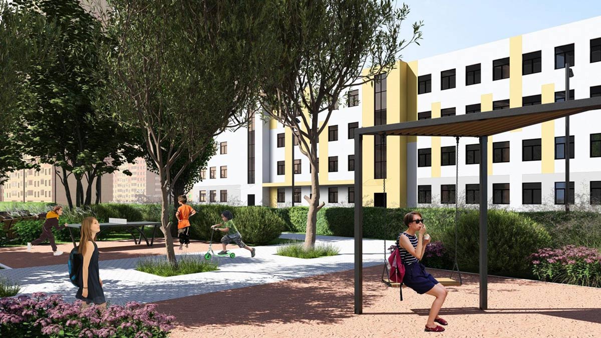 Главной осью первой станет аллея со светильниками, деревьями и кустарниками, создающими атмосферу уюта и защищенности. Променад соединит ключевые точки квартала — жилые дома, школу и остановки общественного транспорта.