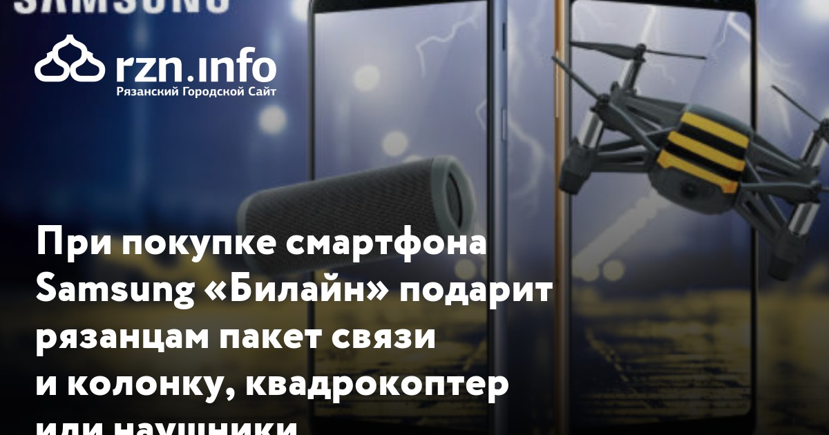 С 6 августа по 16 сентября 2018 года в салонах «Билайн» при покупке смартфонов Samsung Galaxy можно получить в подарок беспроводные наушники Samsung Icon X, портативную колонку JBL Flip 4, квадрокоптер DJI Tello или Bluetooth-наушники JBL E25BT, а также один или два месяца связи на тарифах «ВСЕмое2» и «ВСЕмое3» в зависимости от модели смартфона.*
