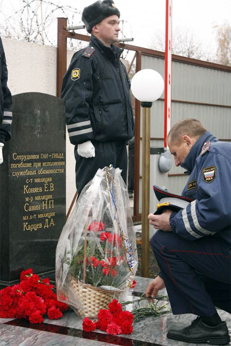 Милиционеры увековечили память троих коллег - инспектора ДПС младшего лейтенанта милиции Дениса Карцева, инспектора по дознанию ОБ ДПС ГИБДД УВД Рязанской области майора милиции Савина Павловича, инспектора дорожного надзора дивизиона дорожного надзора милиции Управления внутренних дел Рязанского облисполкома сержанта милиции Евгения Коняева.