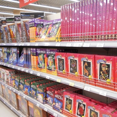 разные наборы для детского творчества, а также товары общего спроса: канцелярия, сувенирная продукция, головоломки, настольные игры, праздничные аксессуары.