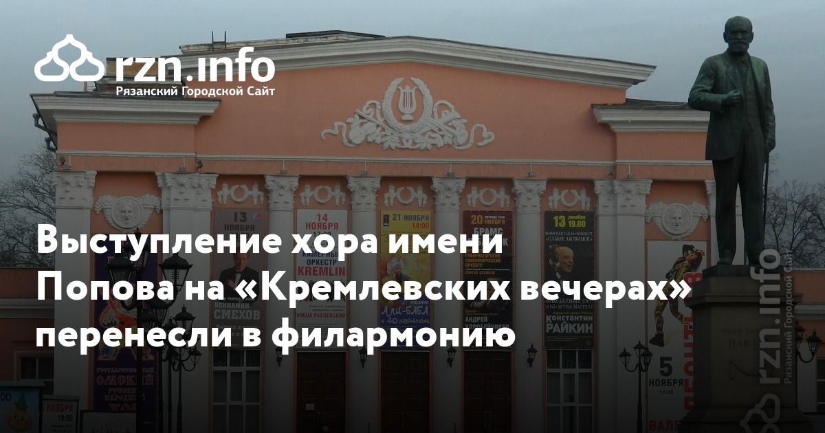 Выступление академического хора имени Попова, а рамках «Кремлевских вечеров» перенесли в зал филармонии из-за погодных условий. Начало в 19:00.