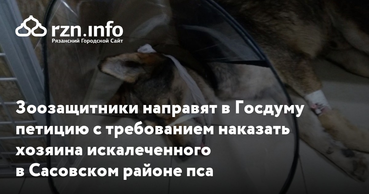 Городская служба по контролю за безнадзорными животными создала с требованием наказать хозяина собаки по кличке Мухтар, которую искалечили в Сасовском районе. Петиция адресована председателю комитета Госдумы по экологии и охране окружающей среды Владимиру Бурматову.