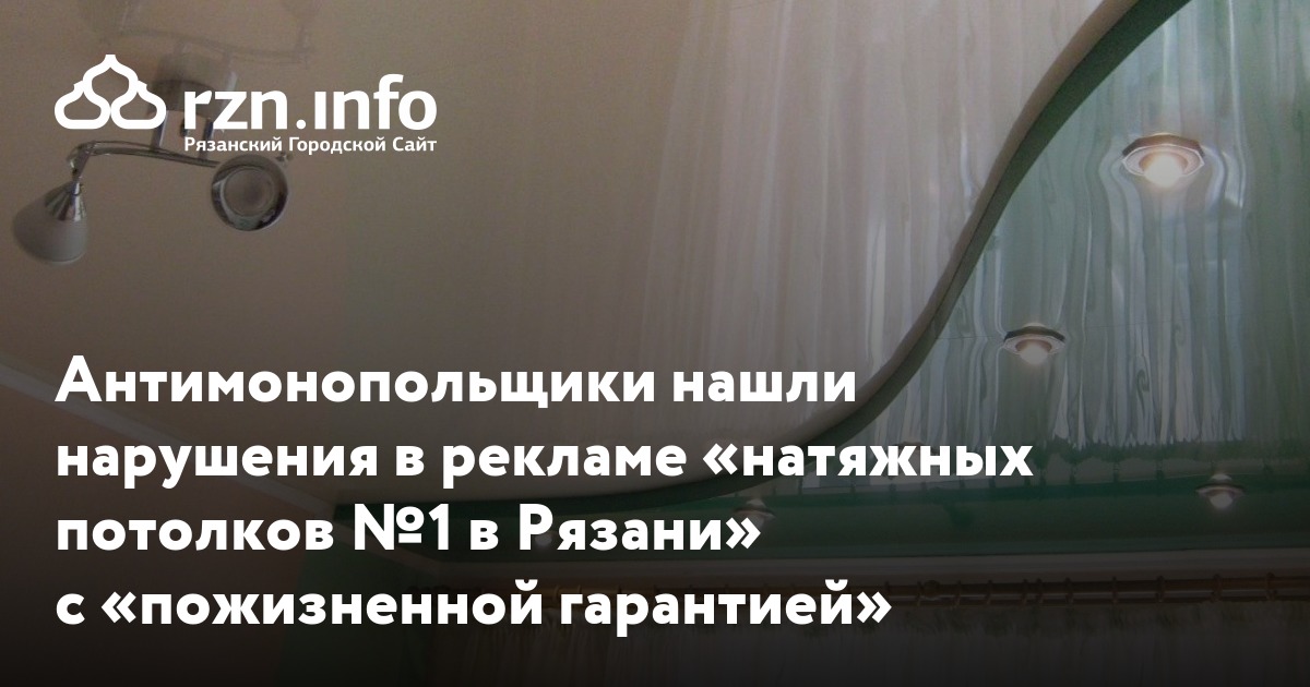 Антимонопольщики посчитали, что информация о «самых лучших ценах в Рязани», «пожизненной гарантии» и «натяжных потолках №1 в Рязани» нарушает закон «О рекламе», так как содержит некорректное сравнение услуг.