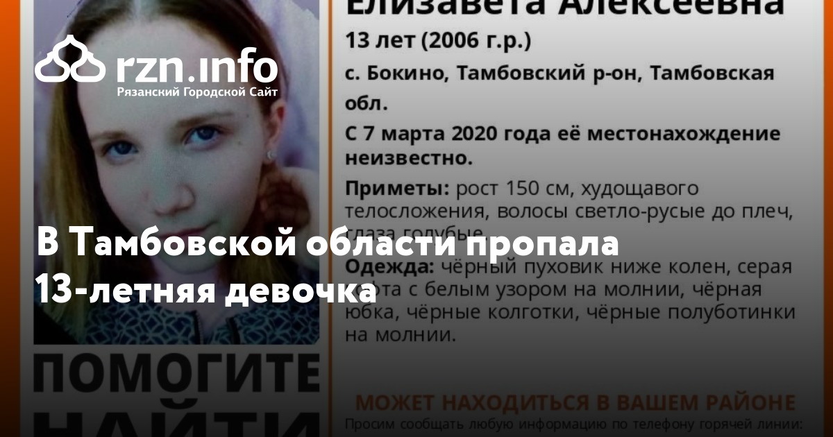 В Тамбовской области ищут 13-летнюю Елизавету Чернову, пропавшую в селе Бокино 7 марта. Об этом сообщил поисково-спасательный отряд «».