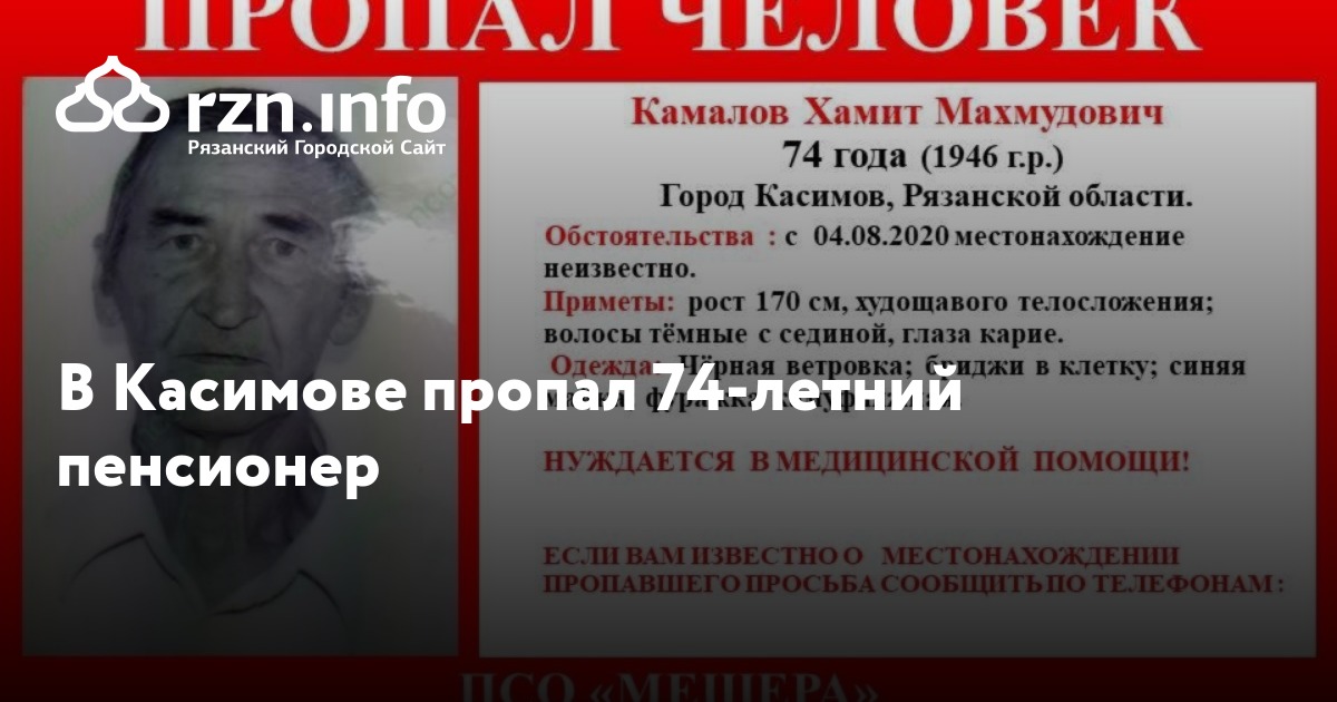 В Касимове пропал 74-летний Камалов Хамит Махмудович, сообщили волонтеры отряда «Мещера».