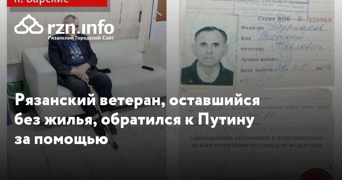 Рязанский ветеран Великой Отечественный войны, оставшийся без жилья, обратился к Владимиру Путину за помощью. Об этом сообщил сайт федерального проекта поддержки населения