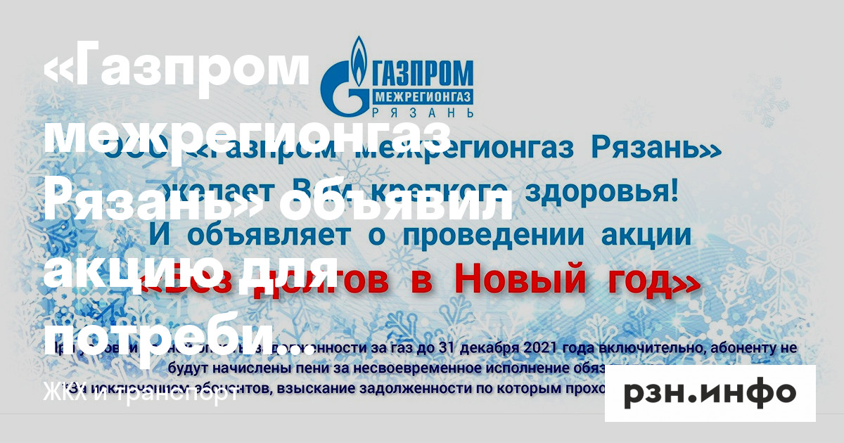 «Газпром межрегионгаз Рязань» объявил о старте акции «Без долгов в Новый год» среди абонентов региона, которая направлена на улучшение платежной дисциплины. В рамках акции задолженности по пени в полном объеме спишут потребителям, которые погасили просроченную задолженность и текущее потребление газа до 31 декабря 2021 года включительно.