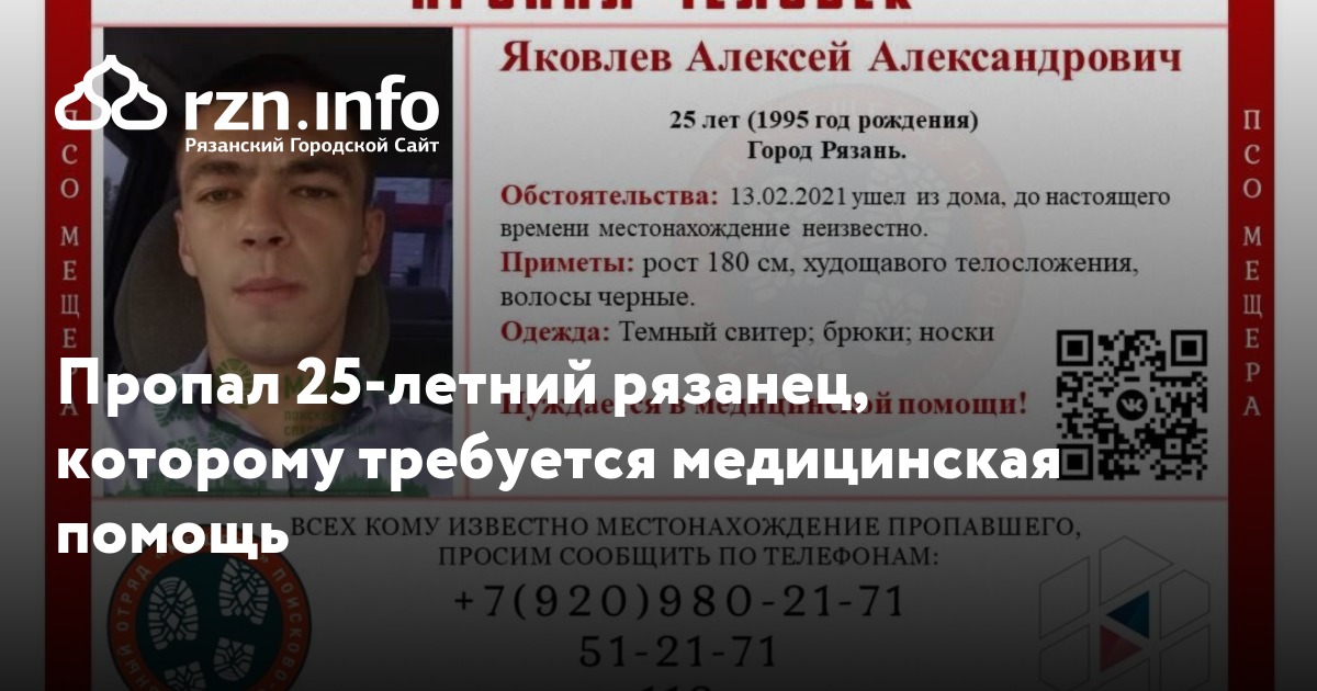 Пропал 25-летний рязанец, которому требуется медицинская помощь