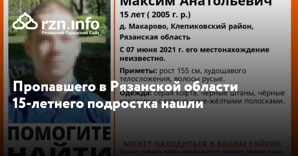 15-летнего Максима Курятникова, пропавшего в Клепиковском районе, нашли живым. Об этом сообщила группа поисково-спасательного отряда «ЛизаАлерт Рязань» «ВКонтакте».