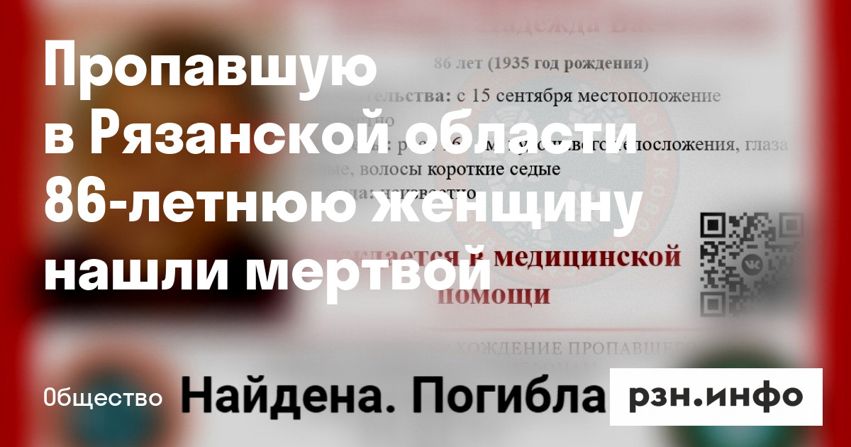 Пропавшую в Рязанской области 86-летнюю женщину нашли мертвой. Об этом сообщили волонтеры поисково-спасательного отряда «Мещера».