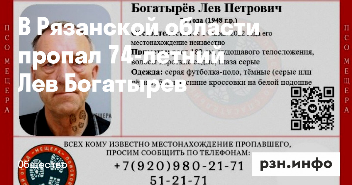 В Рязанской области пропал 74-летний Лев Богатырев. Об этом сообщили волонтеры поисково-спасательного отряда «».
