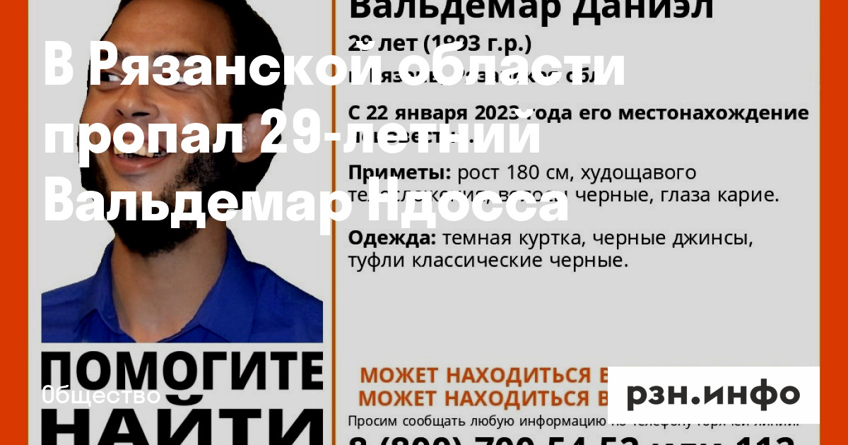 В Рязанской области пропал 29-летний Вальдемар Ндосса. Об этом сообщили волонтеры поисково-спасательного отряда «ЛизаАлерт».