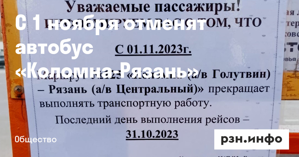 С 1 ноября 2023 года маршрут № 125 Коломна — Рязань будет отменен. Соответствующее объявление появилось на автовокзале города, пишут очевидцы.