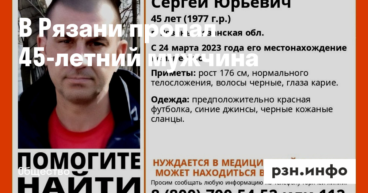 В Рязани разыскивают Сергея Юрьевича Костюкова 1977 года рождения. С 24 марта его местонахождение неизвестно.