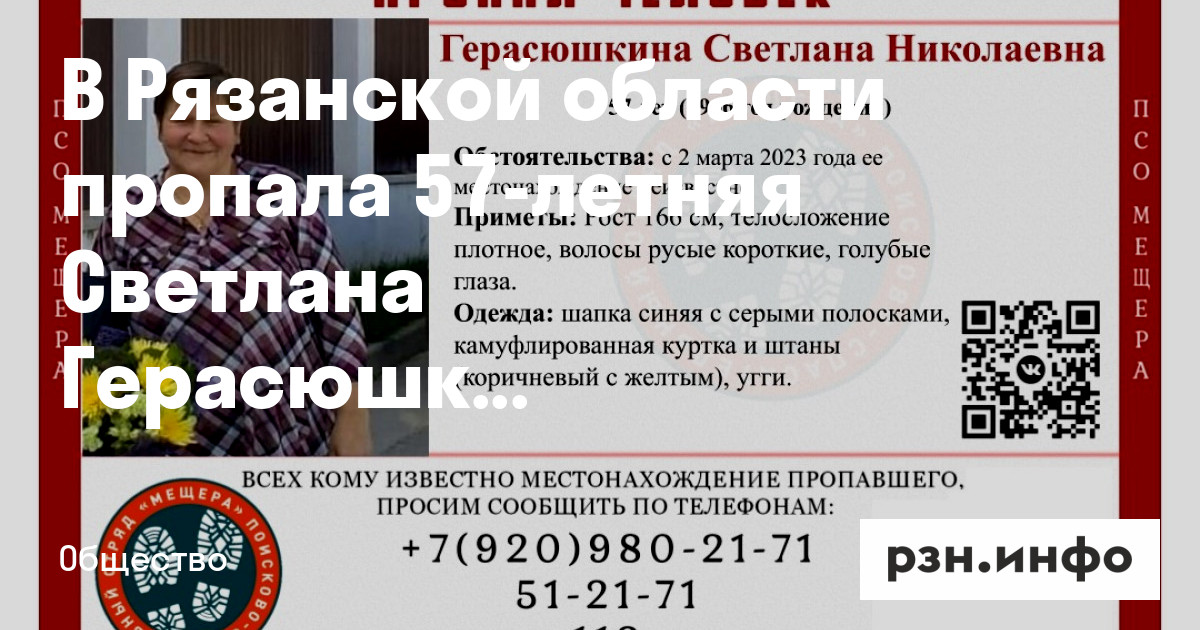 Всех, кто знает о месте нахождения Светланы Герасюшкиной, просят позвонить по телефонам: +7 (4912) 51-21-71, +7 (920) 980-21-71, +7 (929) 067-16-50 или 112.