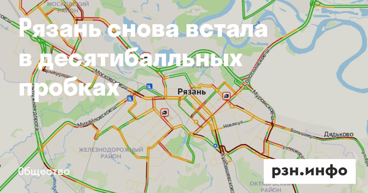 Рязань снова встала в десятибалльных пробках. Об этом свидетельствуют данные сервиса «Яндекс.Карты».