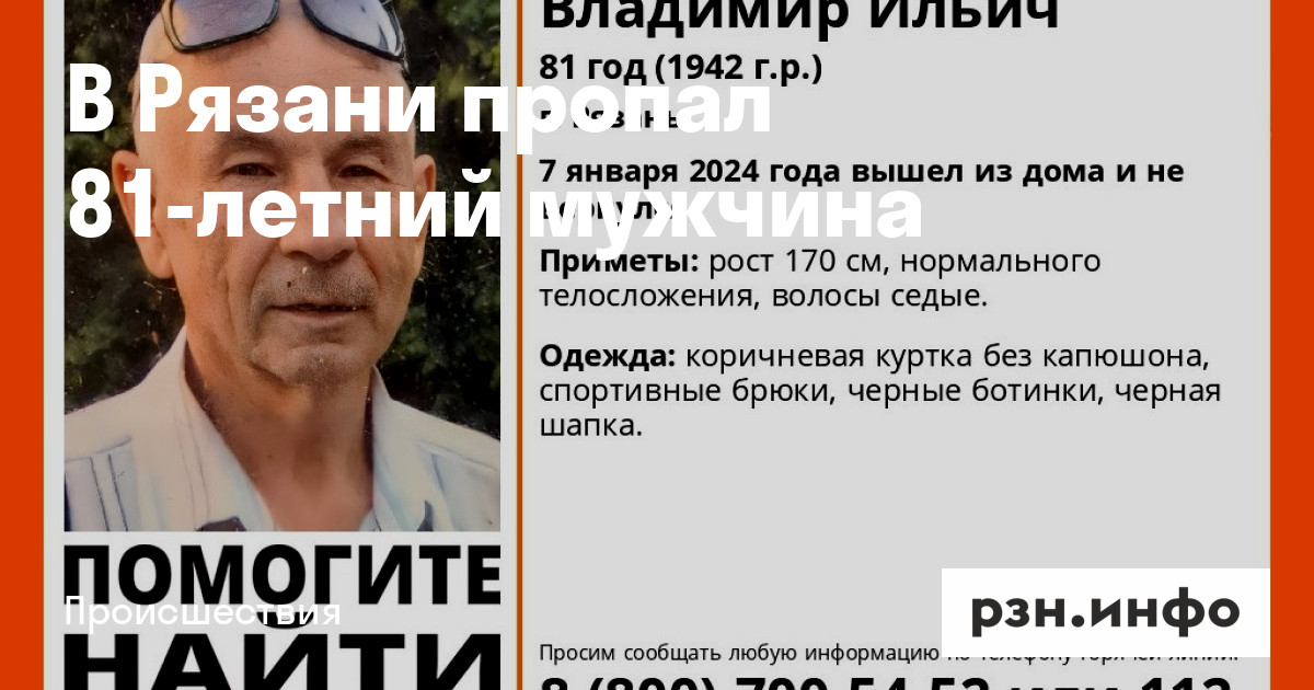 В Рязани пропал Владимир Ильич Андреев 1942 года рождения. В воскресенье, 7 января, он вышел из дома и не вернулся, сообщают волонтеры «ЛизаАлерт».