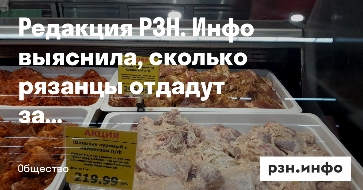 В «Пятерочке» ведро мяса для шашлыка из свинины стоит 279,90 рублей, шашлык «Троекурово» один килограмм обойдется в 239,99 рублей, ребрышки «Слово мясника» в маринаде — 303,99 рублей. Сборный мангал стоит 109 рублей, шампуры — 59,99 рублей за штуку, жидкость для розжига 0,5 литра — 119,99. Древесный уголь для мангала весом 2,5 килограмма обойдется в 279,99 рублей. В среднем мясо для шашлыка будет стоить около 273 рублей. Если рассчитывать, что один рязанец съест килограмм мяса, то шашлычный набор на одного обойдется в 1075 рублей.