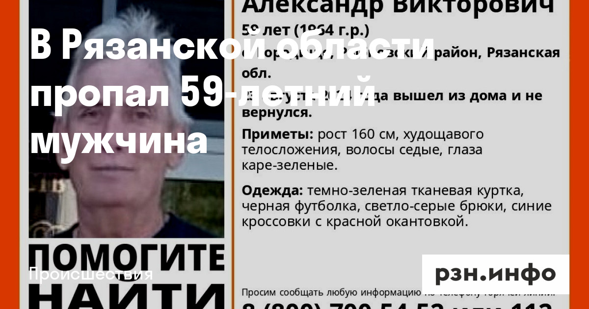 59-летний Александр Феоктистов из села Городище в Рыбновского районе пропал 23 августа. Он вышел из дома и не вернулся.