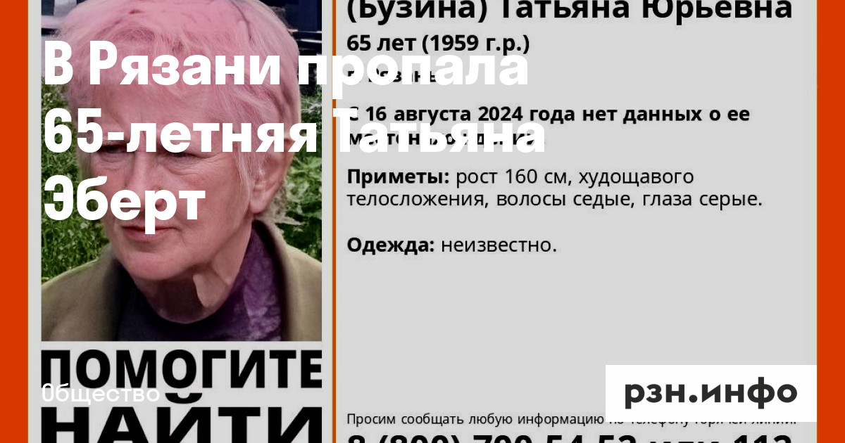 В Рязани пропала 65-летняя Татьяна Эберт. Об этом в среду, 28 августа, сообщил ПСО «ЛизаАлерт».