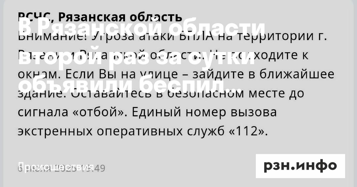 В Рязанской области и областном центре второй раз за сутки объявили беспилотную опасность. Об этом сообщает РСЧС.