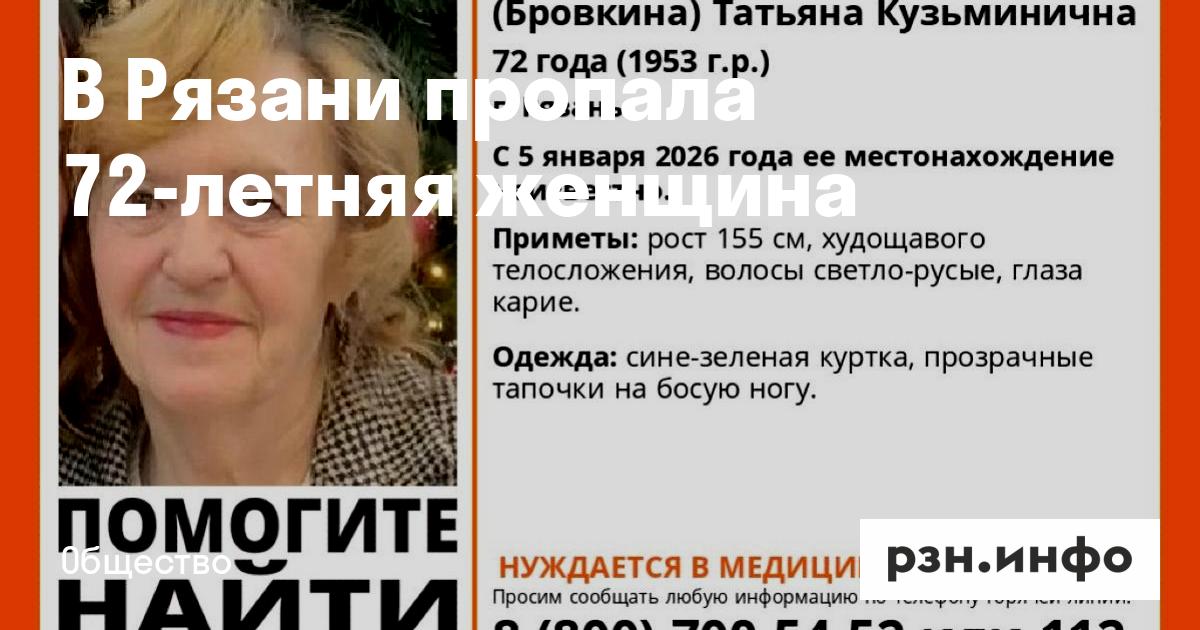 В Рязани пропала 72-летняя Анашина (Боровкина) Татьяна Кузьмична. С 5 января ее местонахождение неизвестно. Об этом сообщает поисково-спасательный отряд «ЛизаАлерт». Среди особых примет: рост 155 см, худощавое телосложение, волосы светло-русые, глаза карие. В день исчезновения она была в сине-зеленой куртке, прозрачных тапочках на босую ногу. Всех, кто располагает какой-либо информацией, просят сообщить по телефону горячей линии «ЛизаАлерт» 8 (800) 700-54-52, инфоргу Екатерине +7 (910) 901-35-82.