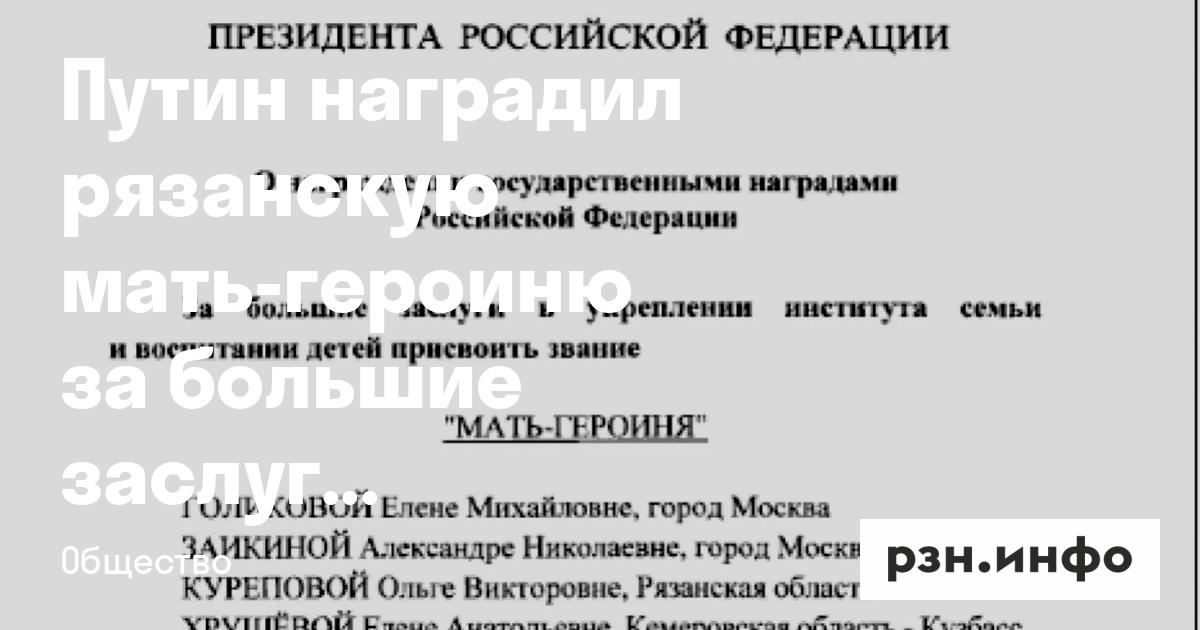 Владимир Путин наградил рязанскую мать-героиню за большие заслуги в укреплении института семьи и воспитании детей. Соответствующий документ разместили на официальном сайте правовых актов.