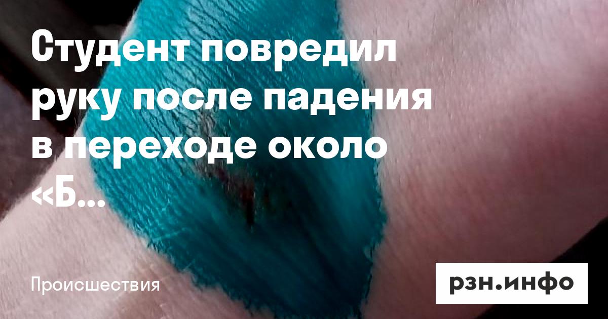 18-летний студент шел домой с учебы, поскользнулся в подземном переходе у «Барса» на Московском и упал на левую руку, рассказала РЗН. Инфо его мать. Инцидент произошел вечером 4 марта, а на следующий день женщина сама упала в переходе. 18-летний рязанец обратился в травмпункт, где ему диагностировали ушиб левого запястья и обработали ссадину. Медицинская справка есть в распоряжении РЗН. Инфо. «Перелома нет, но рука еще болит», — рассказала мать рязанца.