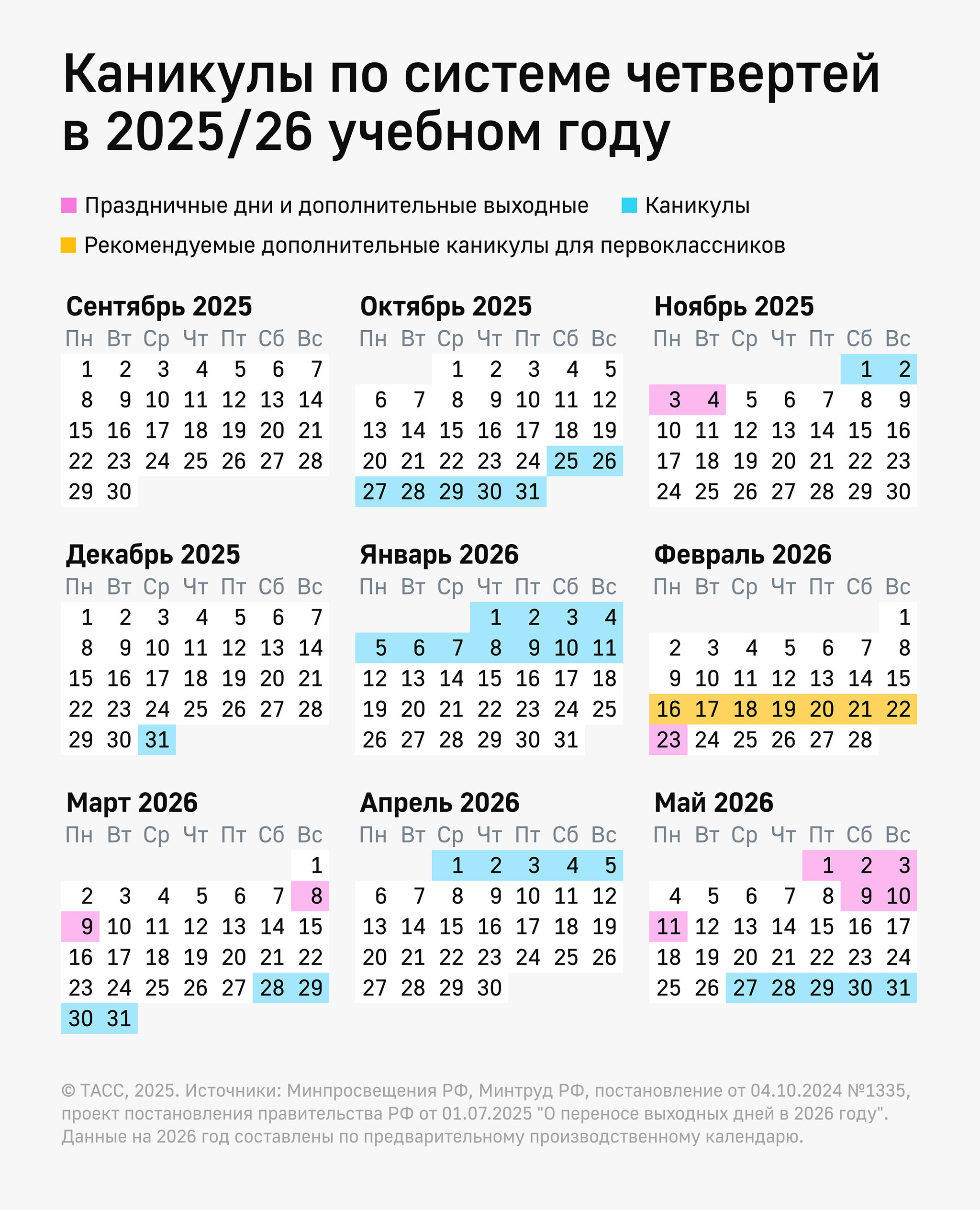 Кроме того, Минпросвещения рекомендует предусмотреть дополнительные каникулы для первоклассников с 16 по 22 февраля.